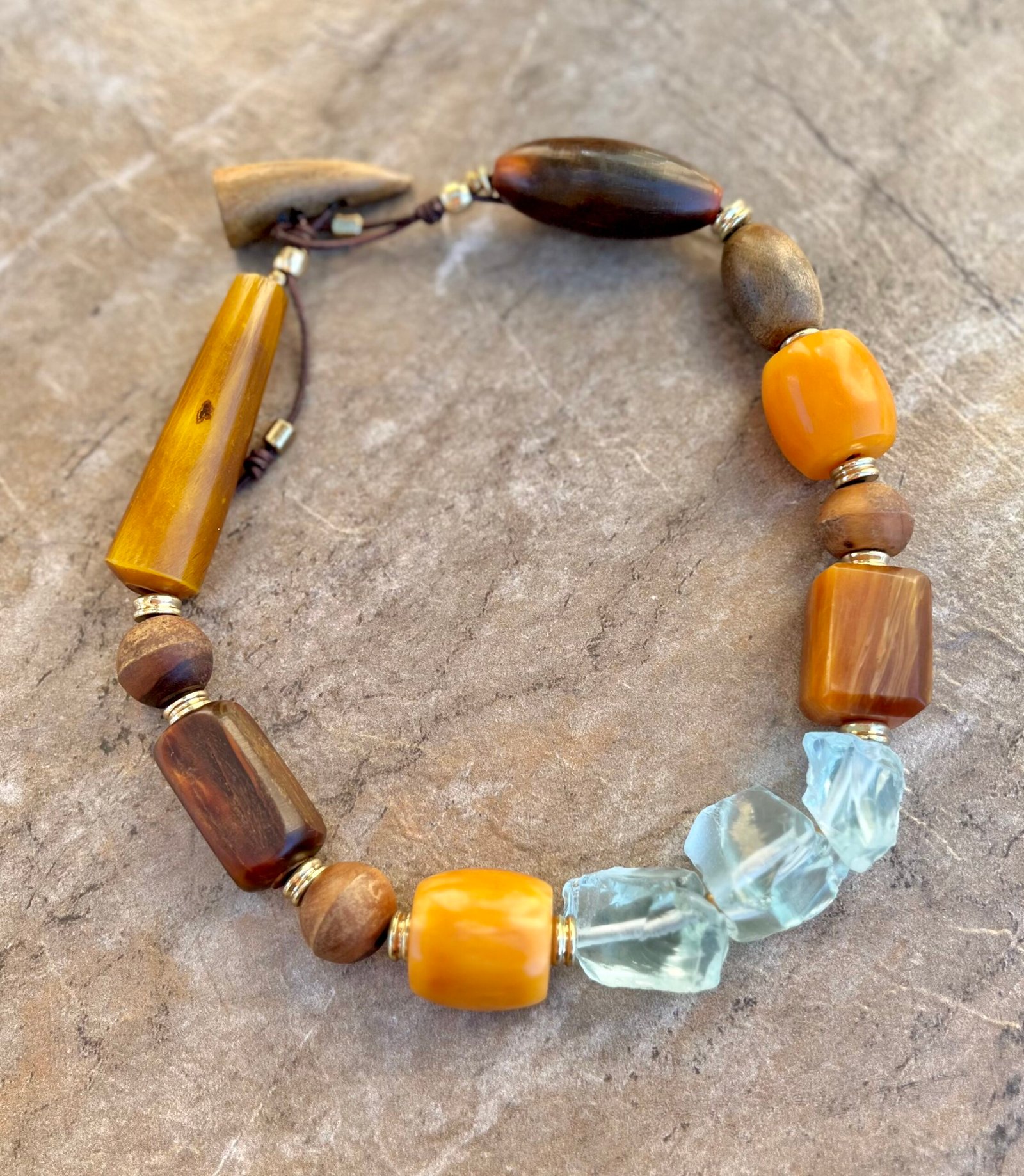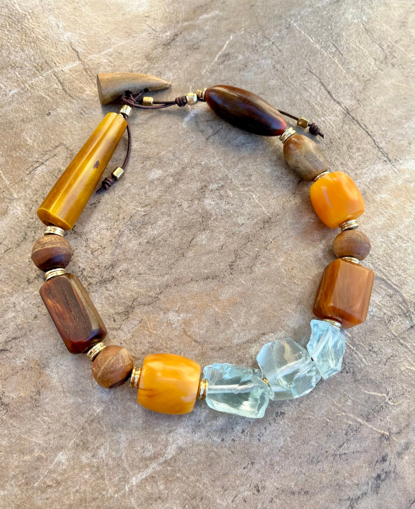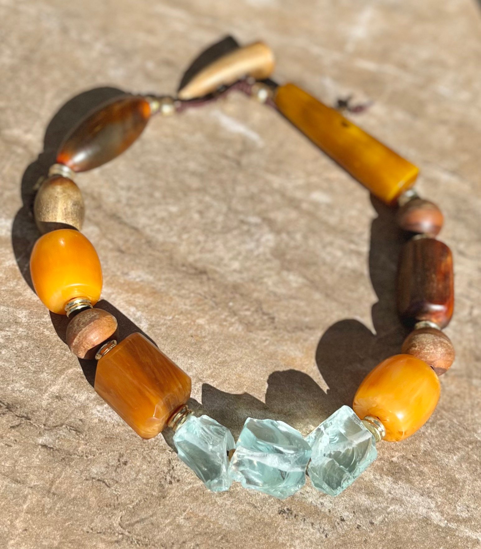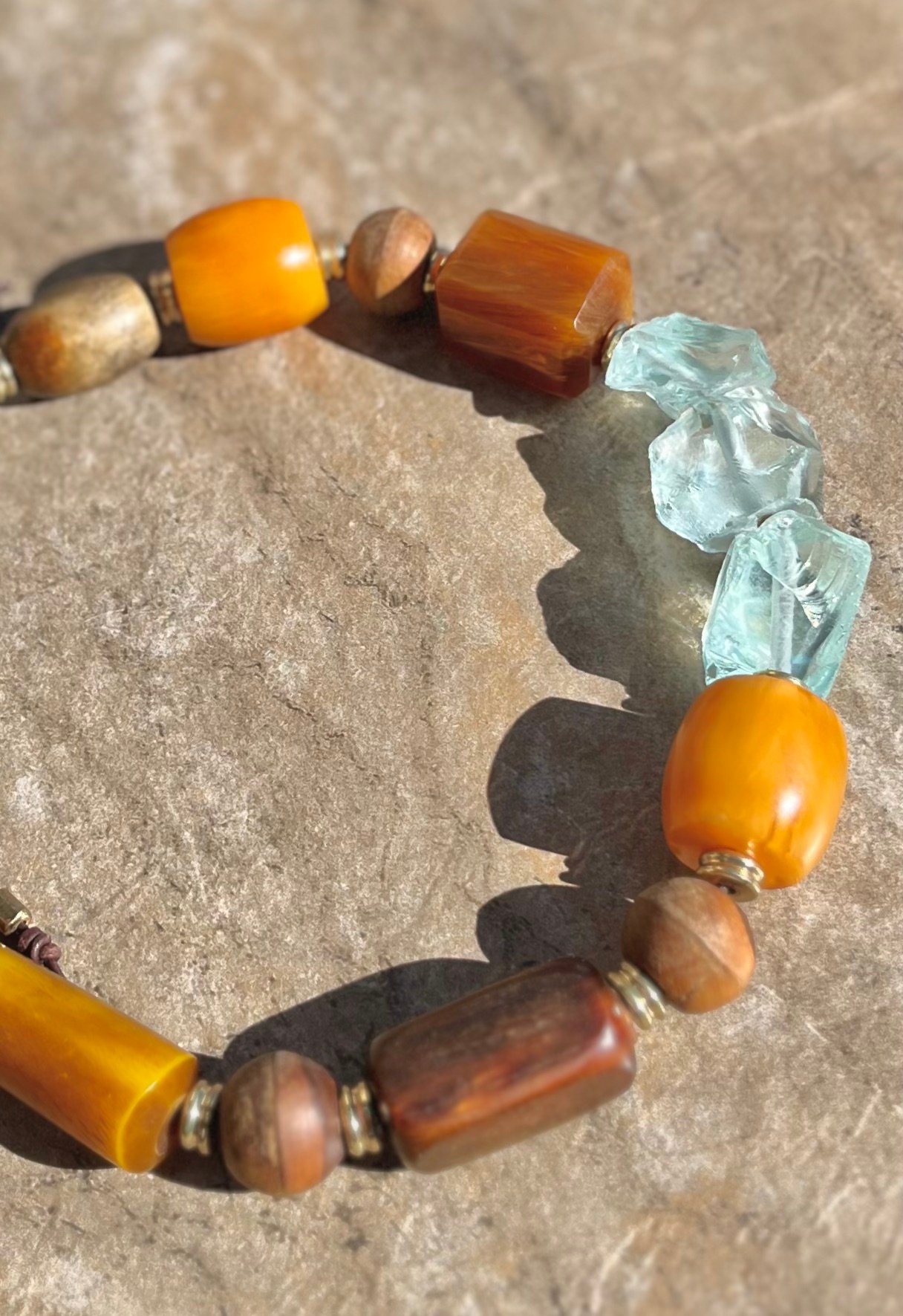 This gorgeous Bohemian Choker is a show-stopping, handcrafted and designed to add a sense of effortless style and sophistication to your collection. Featuring an artisanal blend of aqua crystal, horn, copal, and African tribal beads, this piece resonates with nature-inspired beauty and a relaxed, bohemian chic vibe.