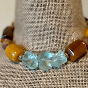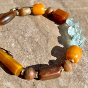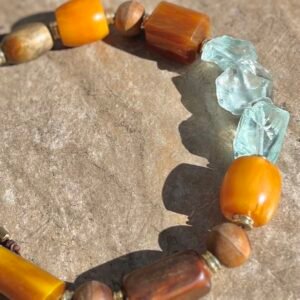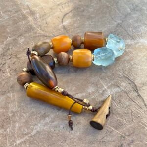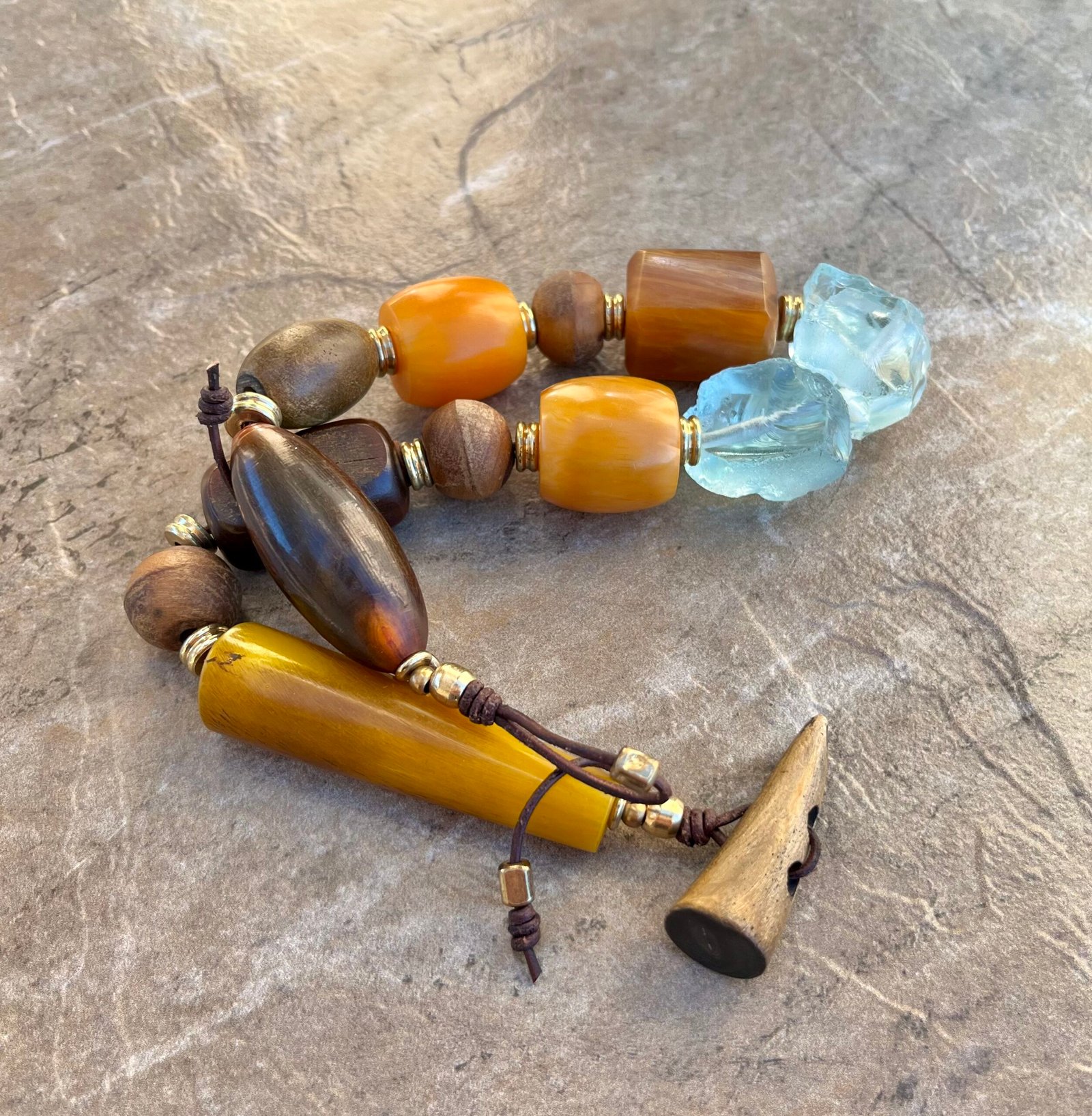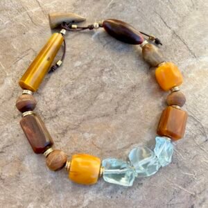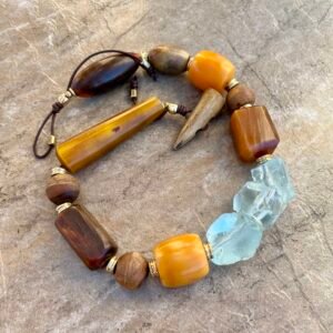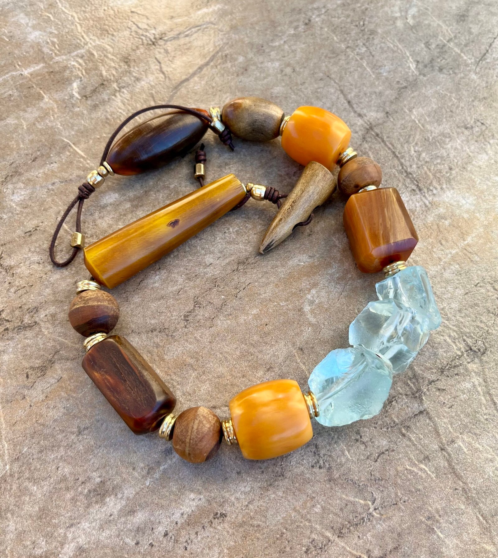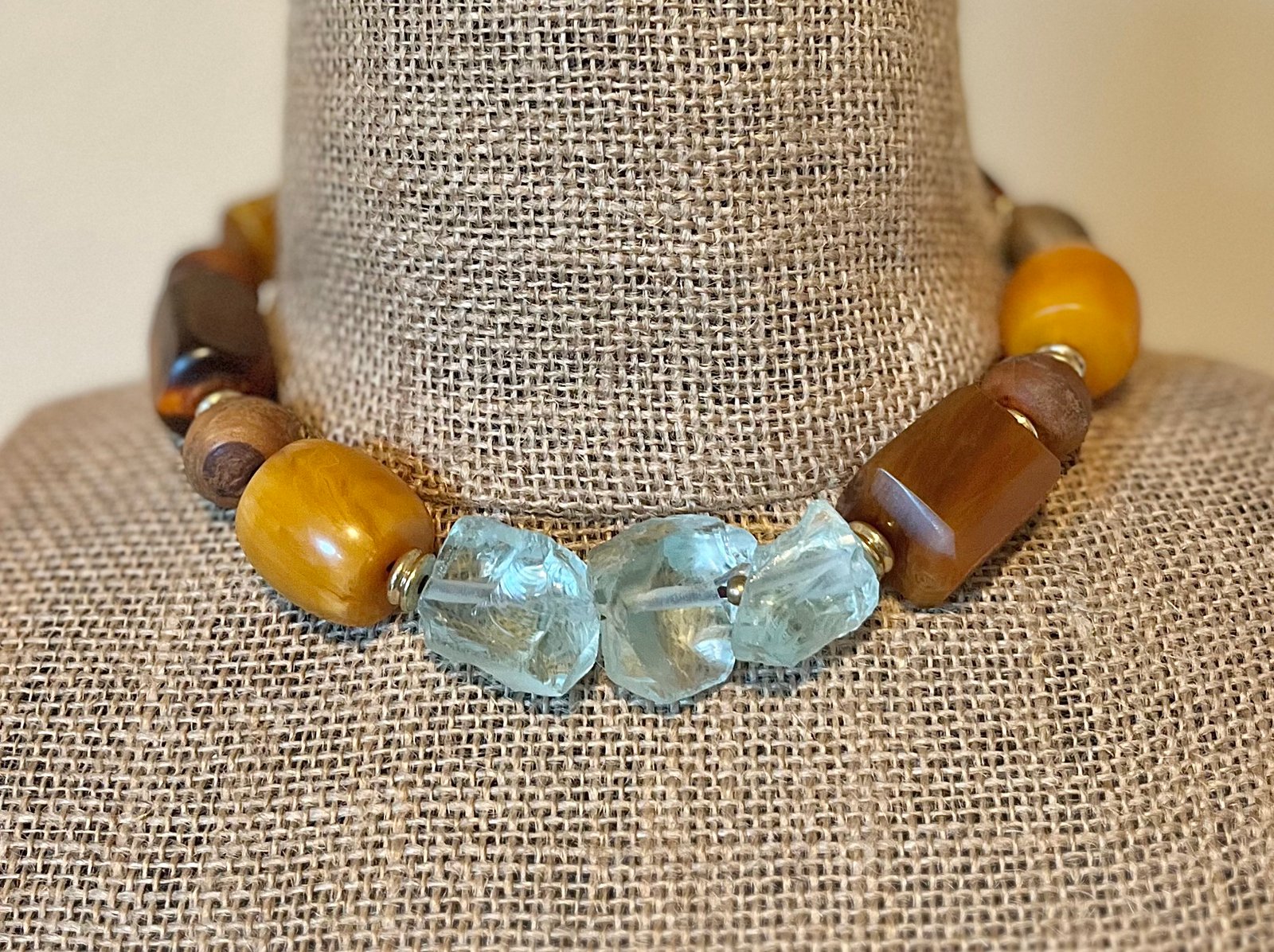 This gorgeous Bohemian Choker is a show-stopping, handcrafted and designed to add a sense of effortless style and sophistication to your collection. Featuring an artisanal blend of aqua crystal, horn, copal, and African tribal beads, this piece resonates with nature-inspired beauty and a relaxed, bohemian chic vibe.
