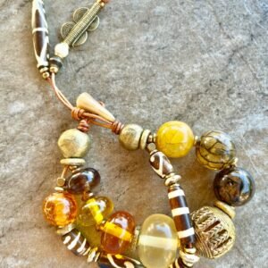 The double strand bracelet is approximately 7.5 inches in length and features a beaded design with a range of terra and amber colors, making it the perfect accessory for any outfit.