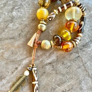 This stunning bohemian bracelet features a unique combination of vintage resin and African tribal beads, creating a one-of-a-kind look that is sure to turn heads. The bracelet is designed with care using materials such as horn, resin, leather, bone, and metal, ensuring durability and longevity.