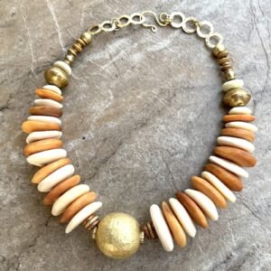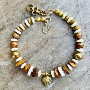 This exquisite 21 inches bohemian necklace is designed with large sky blue dragon skin agate beads, carved bone and African tribal brass beads.