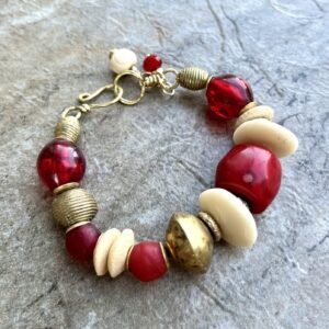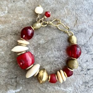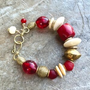 Boho Chic Bracelet Red Coral, African Tribal Brass, Red Resin Beads