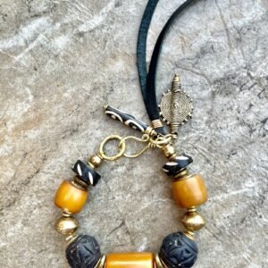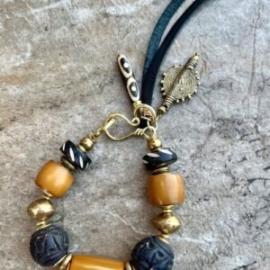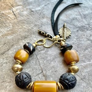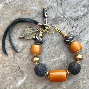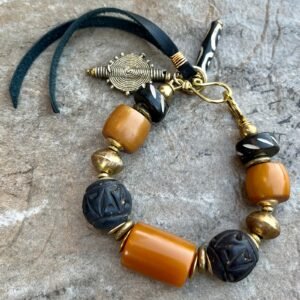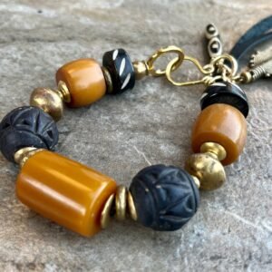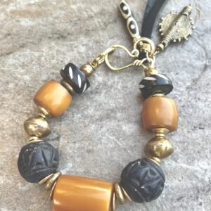 Boho Tribal Bracelet Vintage Amber Resin, African Ethnic Clay, Bone and Brass