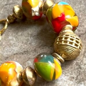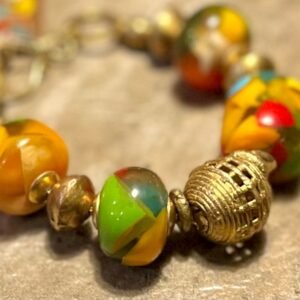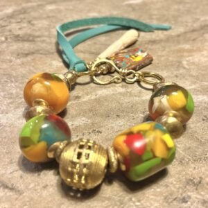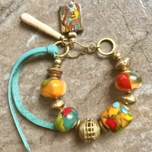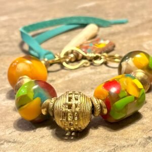 Colorful tribal-boho bracelet designed with: antique resin beads; different kind of African ethnic (lost wax artistry) brass beads and; turquoise natural leather, and hand carved water buffalo bone charms.