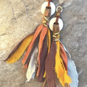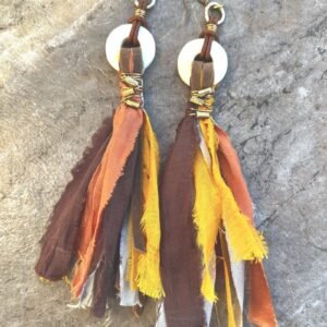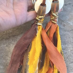 Dramatic bohemian earrings designed with sari silk, natural leather, hand carved bone and African tribal brass beads.