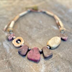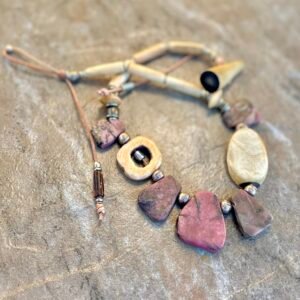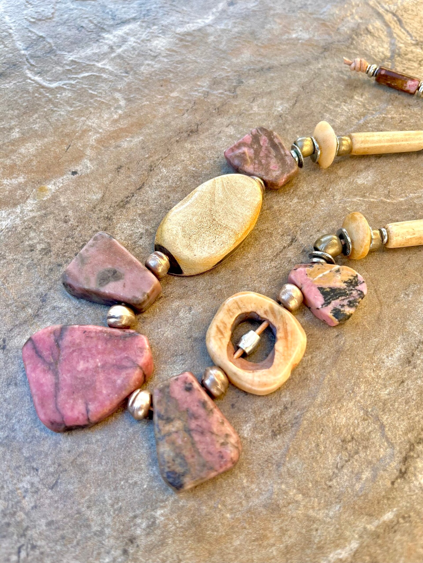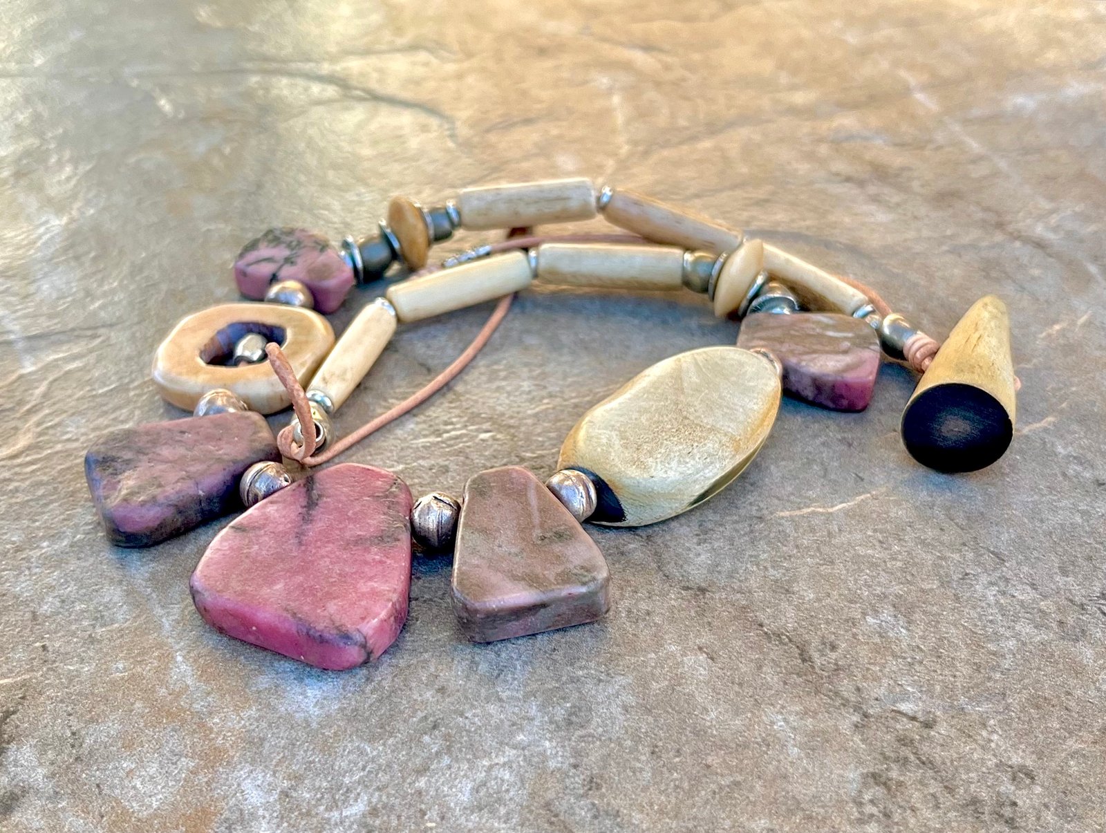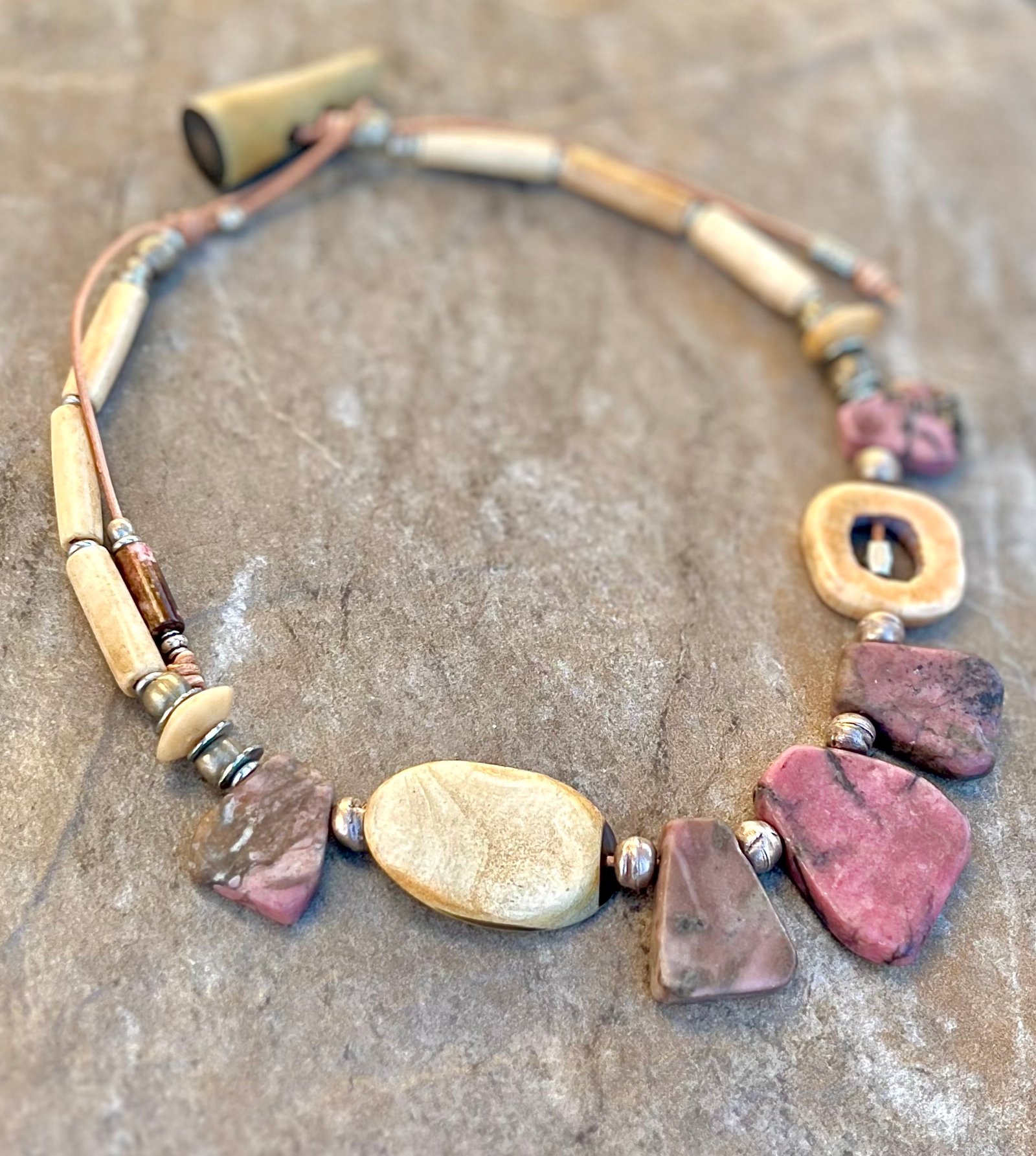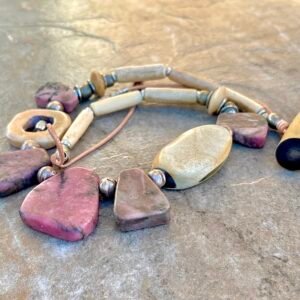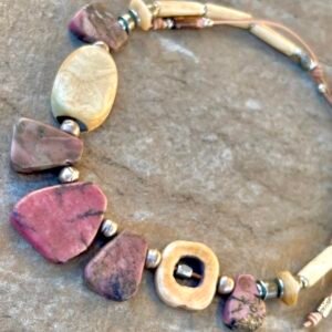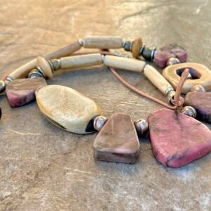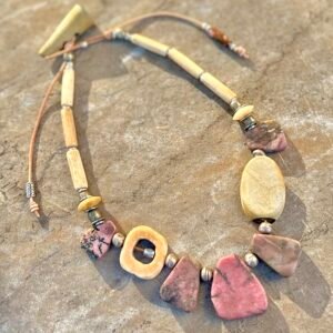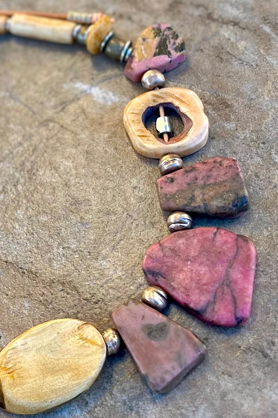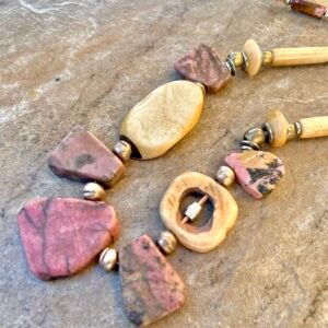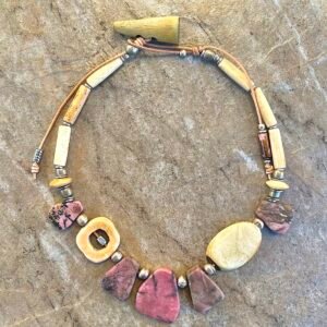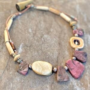 The Pink Rhodonite necklace by Petra di Monte is a handcrafted and artisan jewelry piece that features natural slabs of rhodonite stones set in a beaded choker style with carved buffalo bone beads.