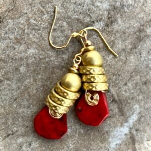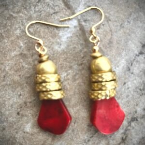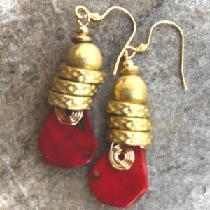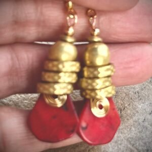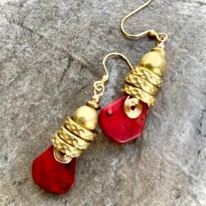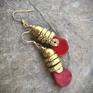 Tribal Bohemian Earrings Red Coral Spiral African Trade Brass Handmade Beads