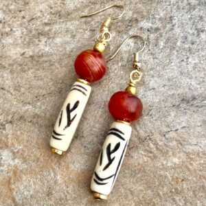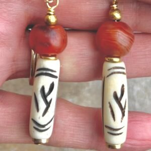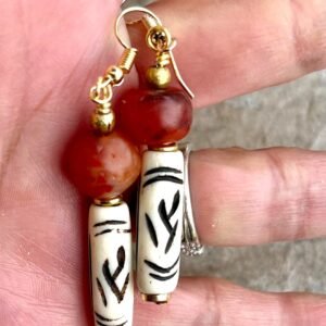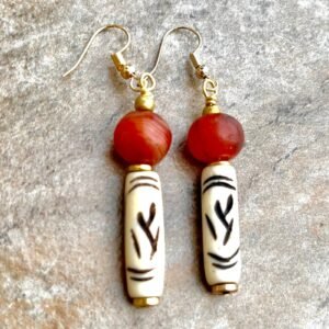 Handcrafted with love, these earrings feature a unique mix of African tribal carved bone and carnelian agate stone beads.