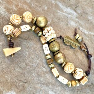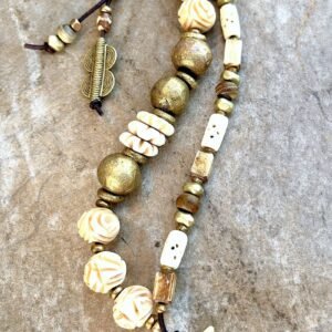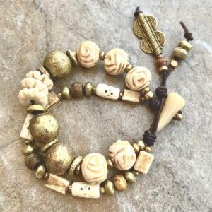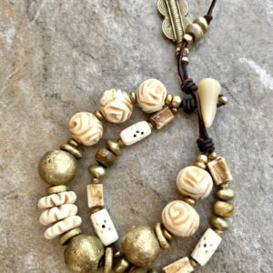 Tribal chic bracelet designed with two rows of beautiful African ethnic beads as: hand carved buffalo bone, lost wax brass, horn beads and button clasps and, natural distressed leather.
